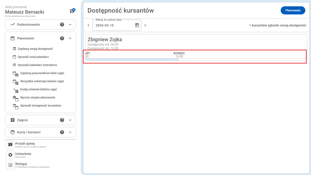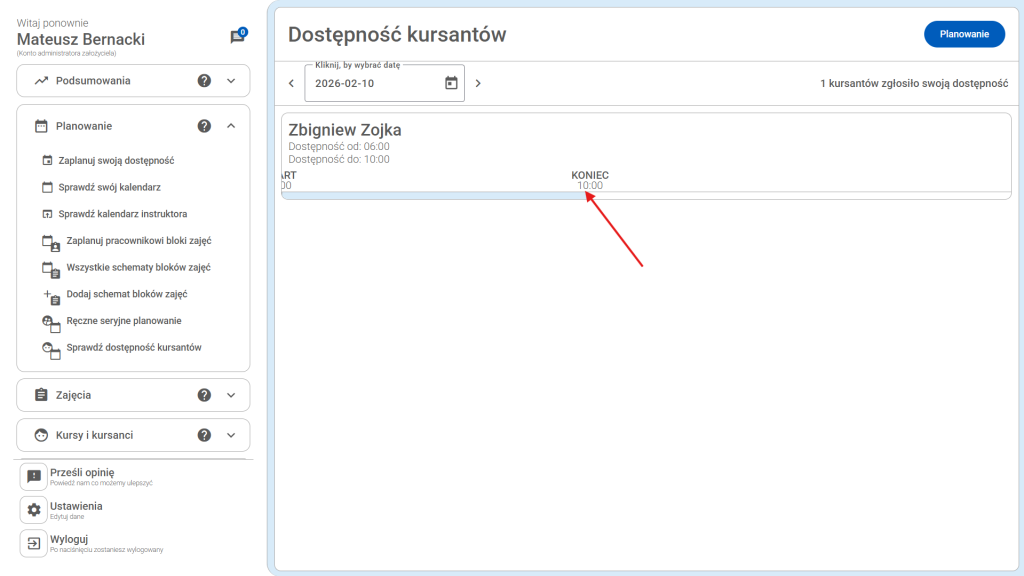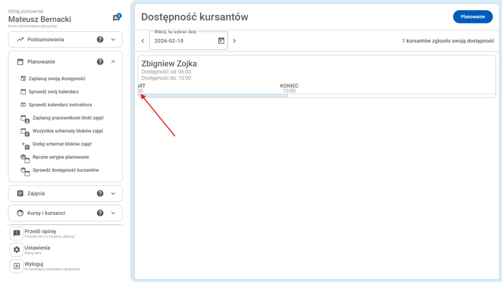 By zobaczyć zgłoszoną przez kursanta dostępność – rozwiń zawartość modułu „Planowanie”, który znajduje się w lewym pasku (drugi od góry).